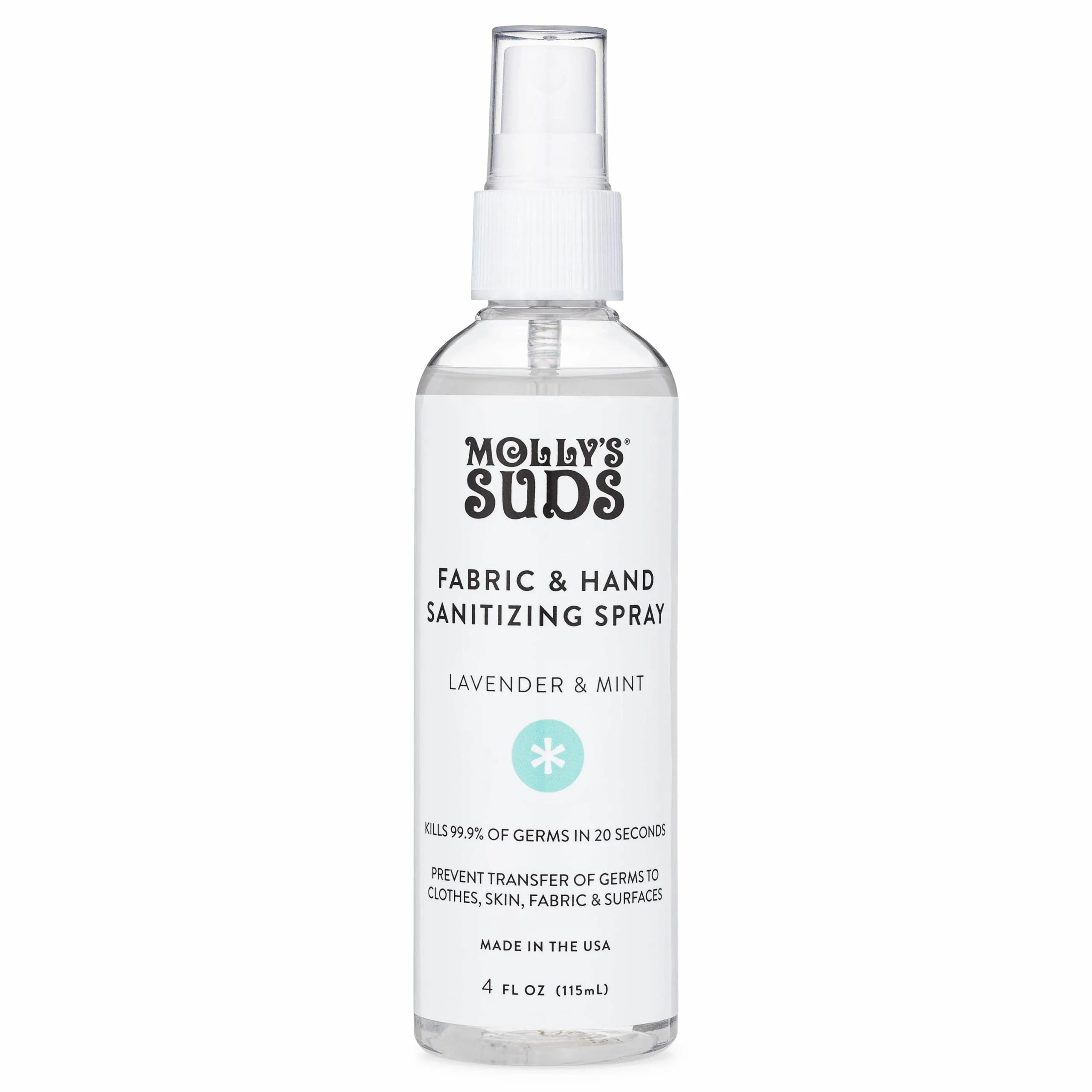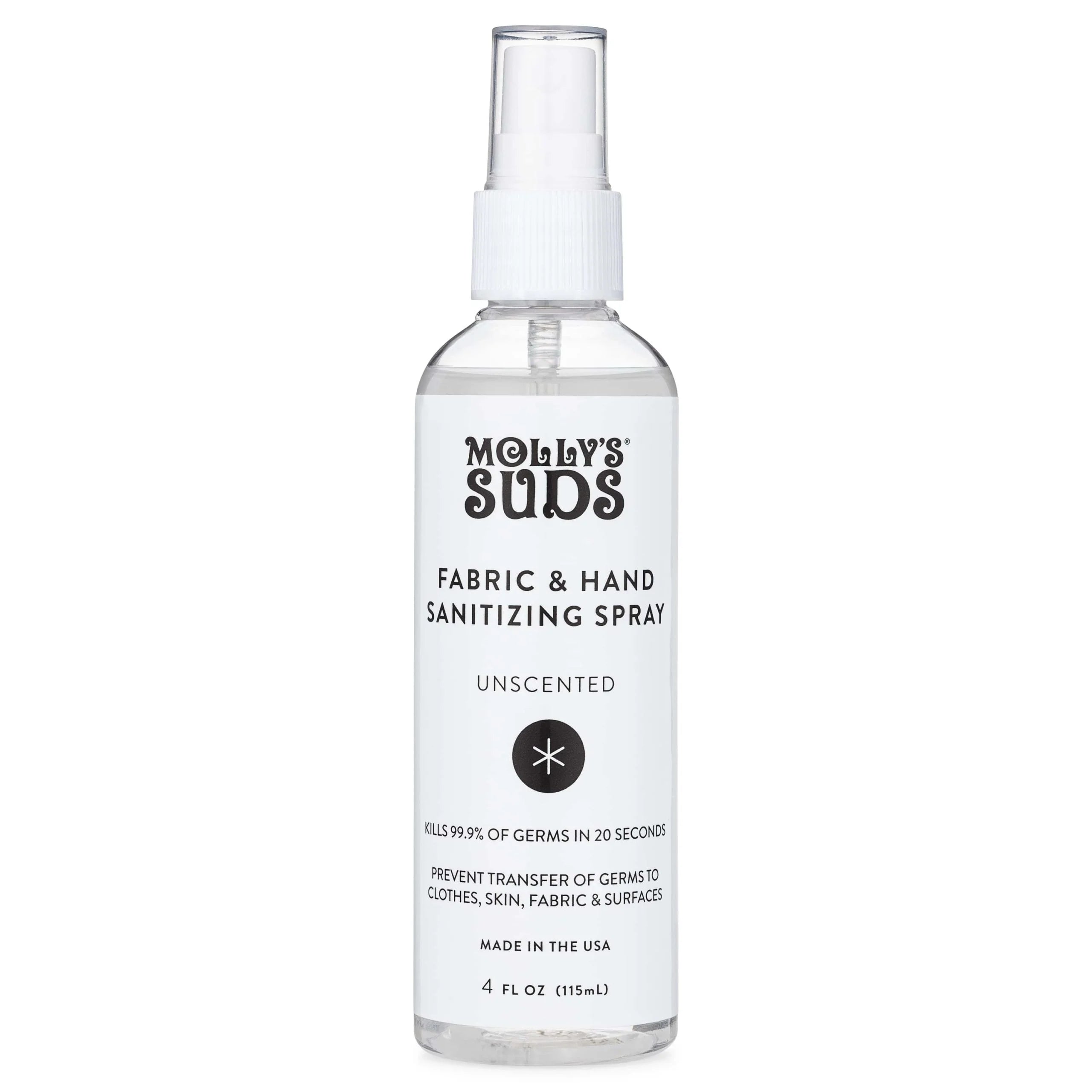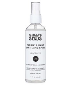 Molly’s Suds Fabric and Hand Sanitizer does not contain: Synthetic Fragrances, Formaldehyde & 1,4-Dioxane, Optical Brighteners, Synthetic Nonylphenol Ethoxylates, Phosphates, Chlorine, Sodium Laureth Sulfate (SLES), Phthalates, Parabens, Methylisothiazolinone, Cocamide DEA