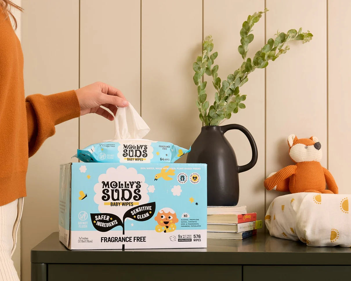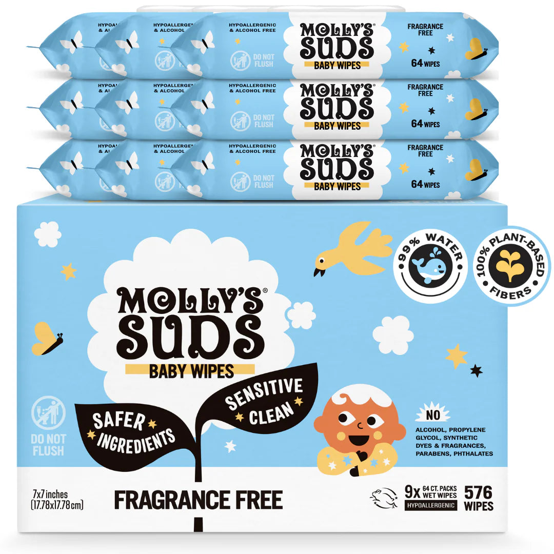 We know firsthand how important truly clean ingredients are, especially for products that touch our skin. When it comes to our tiniest family members, this is even more true – keeping baby’s skin clean and free from harsh chemicals and irritants is of utmost importance to parents everywhere. That’s why we developed Molly’s Suds Sensitive Clean Baby Wipes: made with 99% water and free from alcohol, parabens & phthalates, artificial fragrances, and other harsh chemicals, they deliver the care-free clean you and your baby deserve.